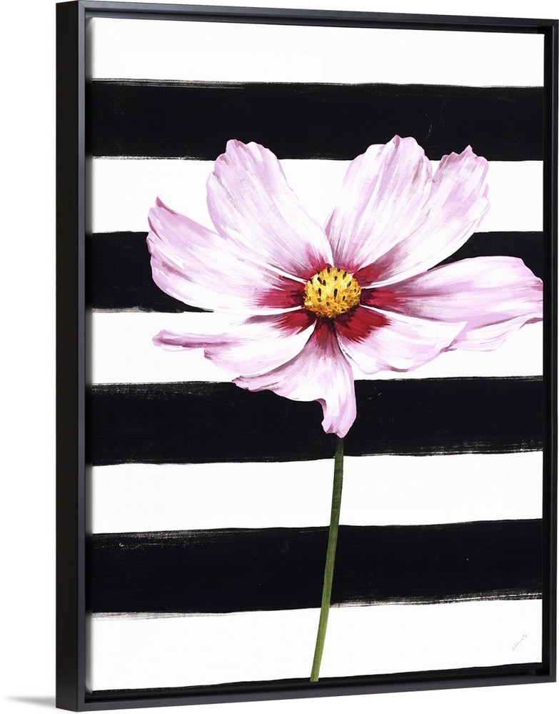 <p>A single pink flower over a black and white striped background.</p>