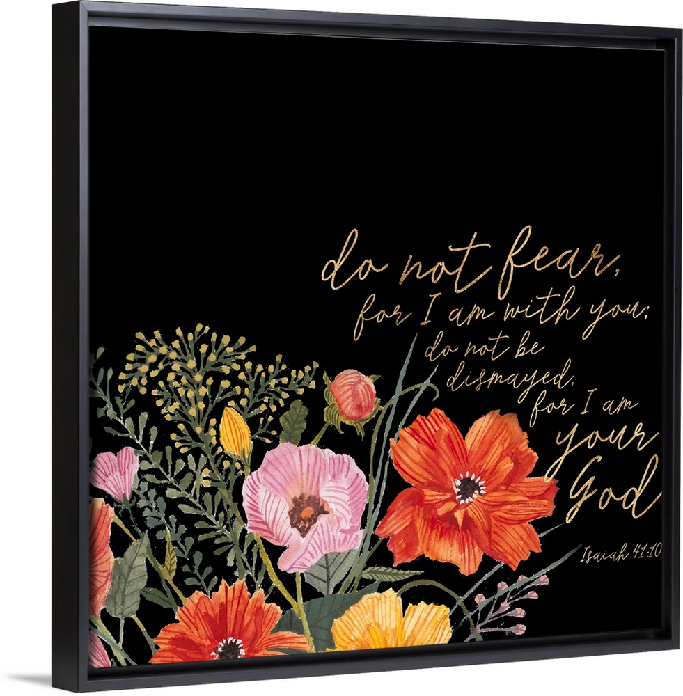 <p>This decorative artwork features the words: Do not fear, for I am with you; do not be dismayed, for I am your God, (Isaiah 41:10) in gold color over a black background with charming flowers underneath.</p>