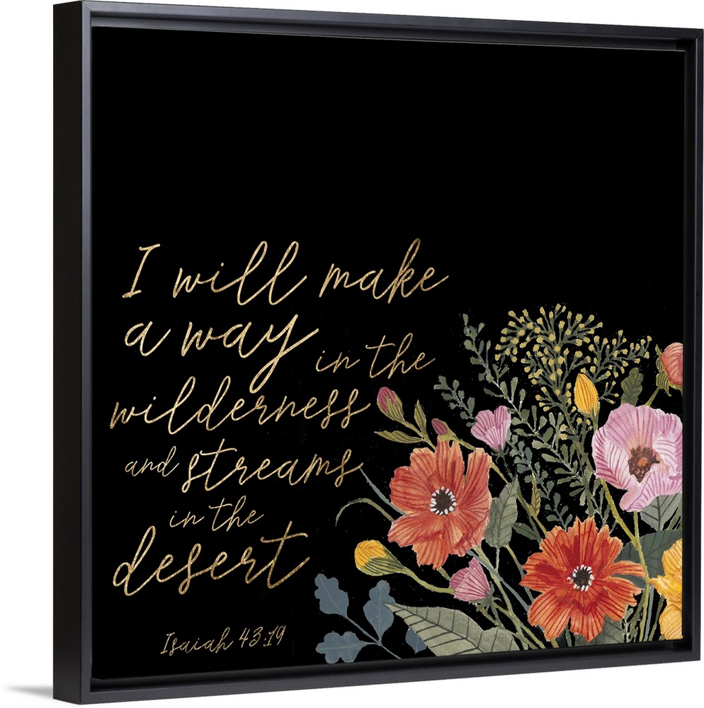 <p>This decorative artwork features the words: I will make a way in the wilderness and streams in the desert, (Isaiah 43:19) in gold color over a black background with charming flowers underneath.</p>