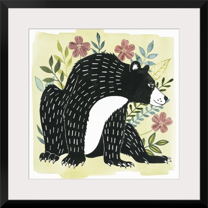 <p>A square decorative design of a black and white bear surrounded by flowers on a pale yellow background.</p>