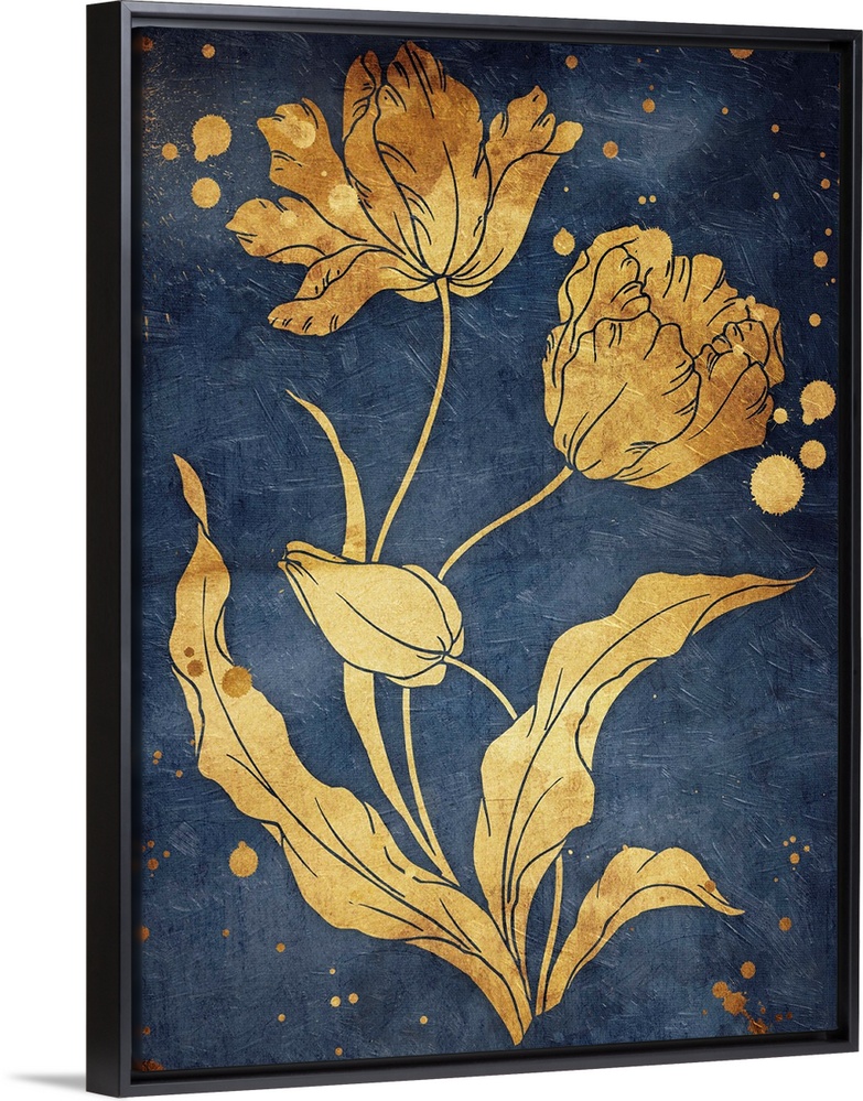 <p>Gold tone tulips illustrated on a navy blue background.</p>