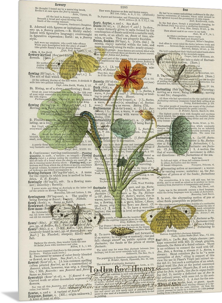 <p>Vintage style artwork of dictionary page with a flower in the center of the image. With butterflies hovering around.</p>