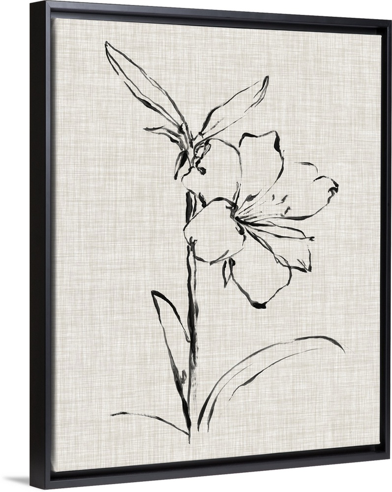 <p>A black ink drawing of a flower against of beige linen background.</p>