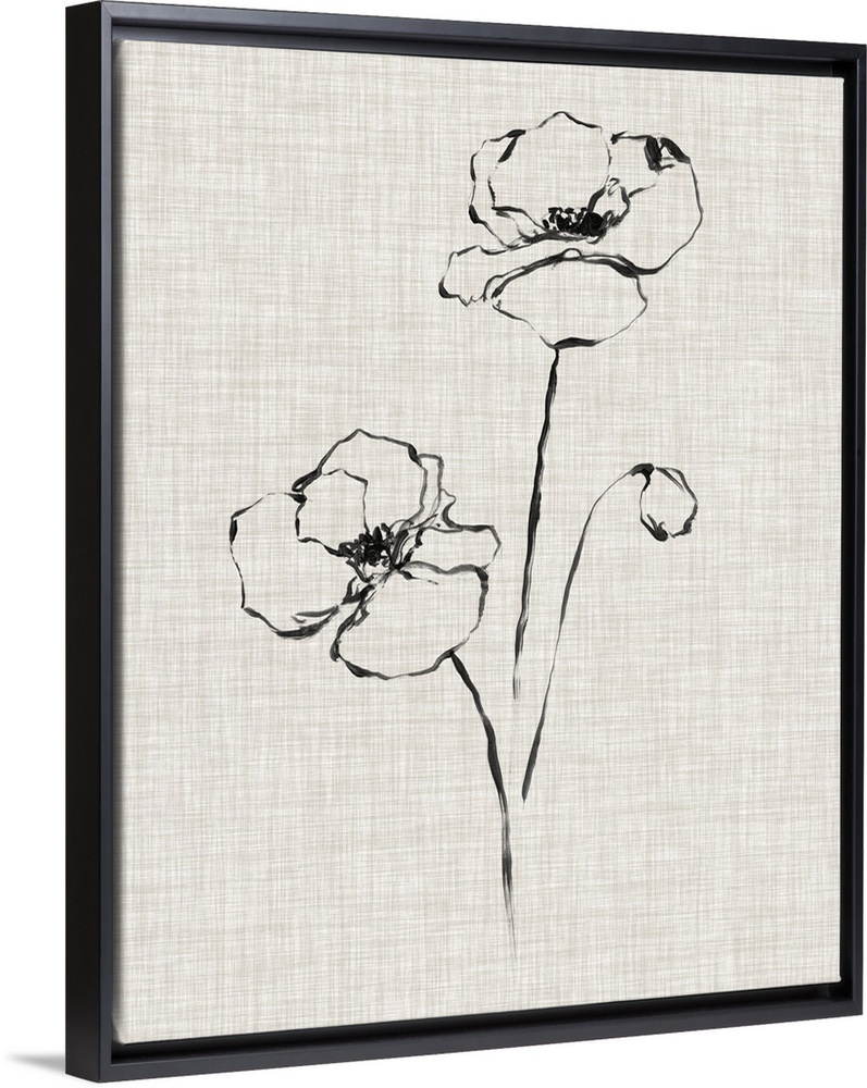 <p>A black ink drawing of a flower against of beige linen background.</p>