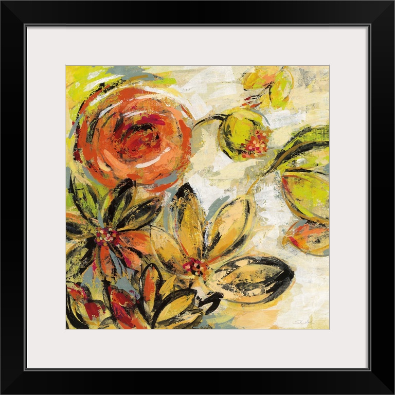 <p>Square floral abstract painting on a neutral colored background.</p>