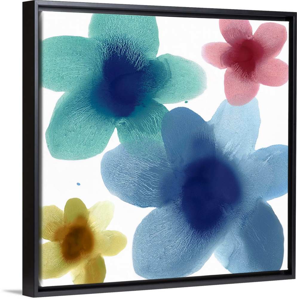 <p>Square abstract art with floral prints in blue, teal, yellow, and pink on a white background.</p>