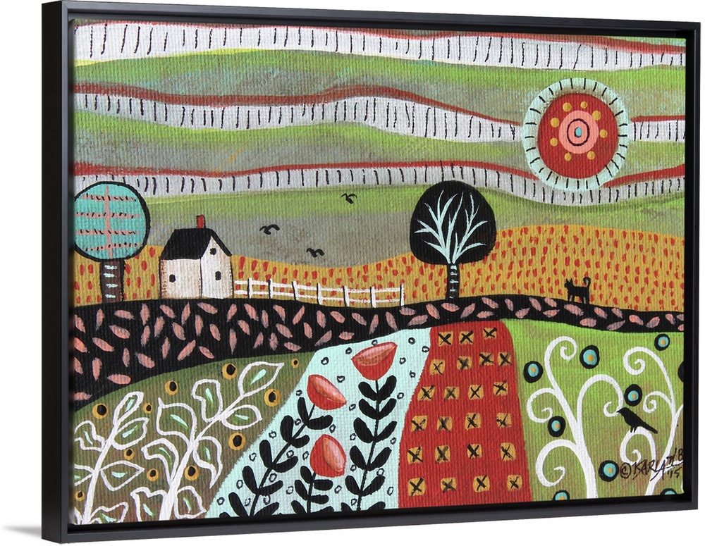 <p>Contemporary folk-art style painting of a rolling hill landscape with houses and patchwork fields.</p>