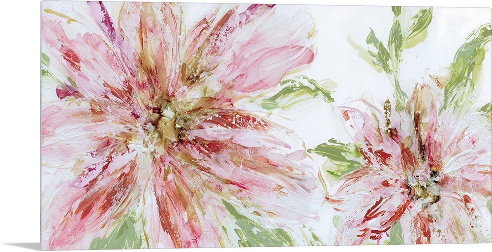<p>Large painting of two abstract flowers in shades of pink and red with green leaves on a white background.</p>