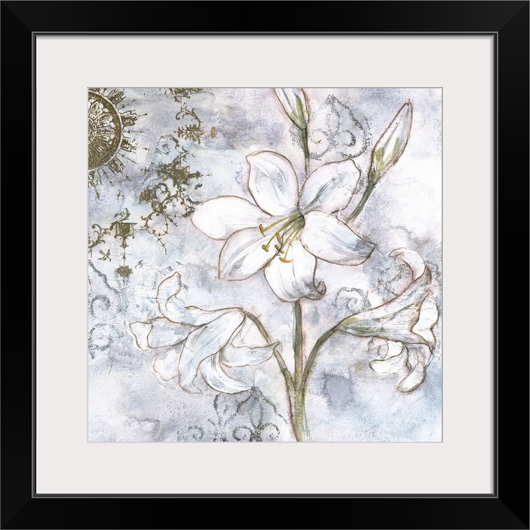 <p>Contemporary artwork of a stem of white lilies with gold accents and a textured background.</p>