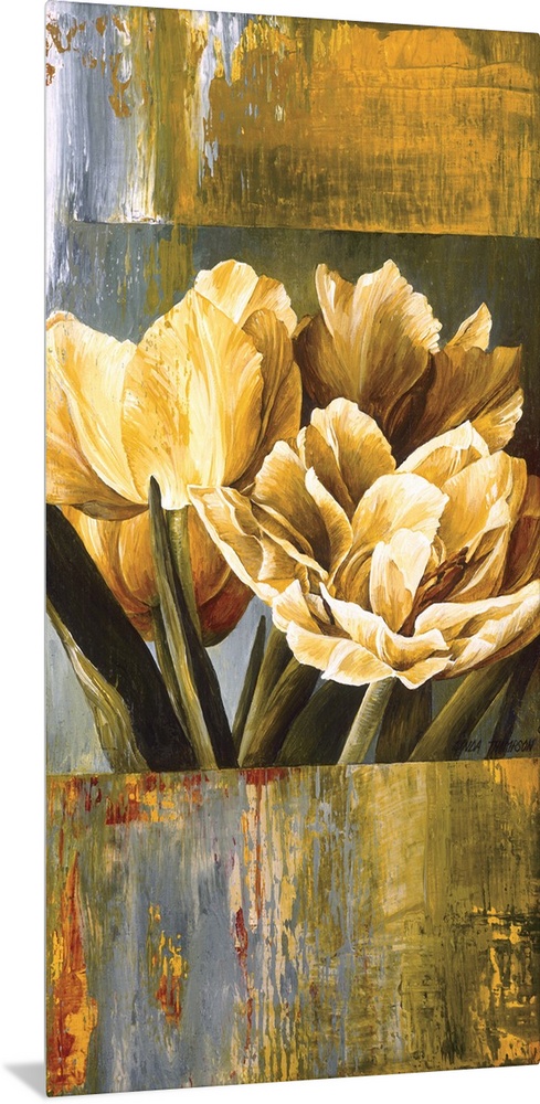 <p>A long vertical design of yellow tulips edged with a textured orange and green border.</p>