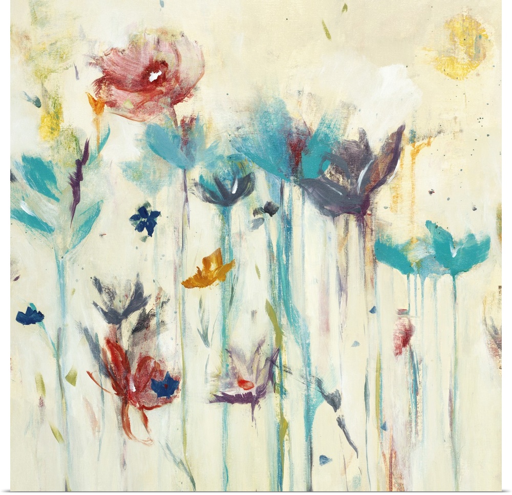 <p>Square contemporary painting of a group of colorful flowers with long stems on a neutral background.</p>