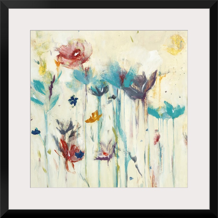 <p>Square contemporary painting of a group of colorful flowers with long stems on a neutral background.</p>