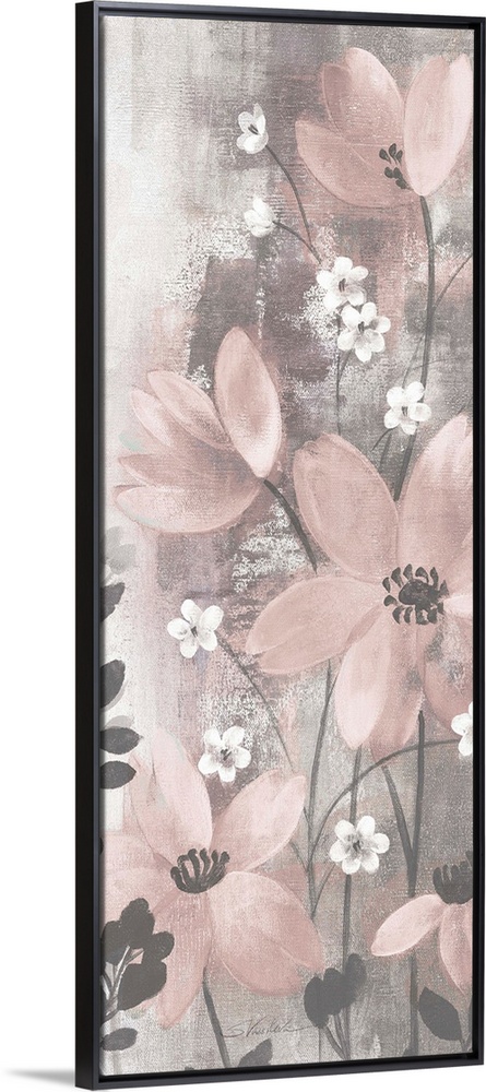 <p>Contemporary artwork of pink flowers over a distressed gray background.</p>