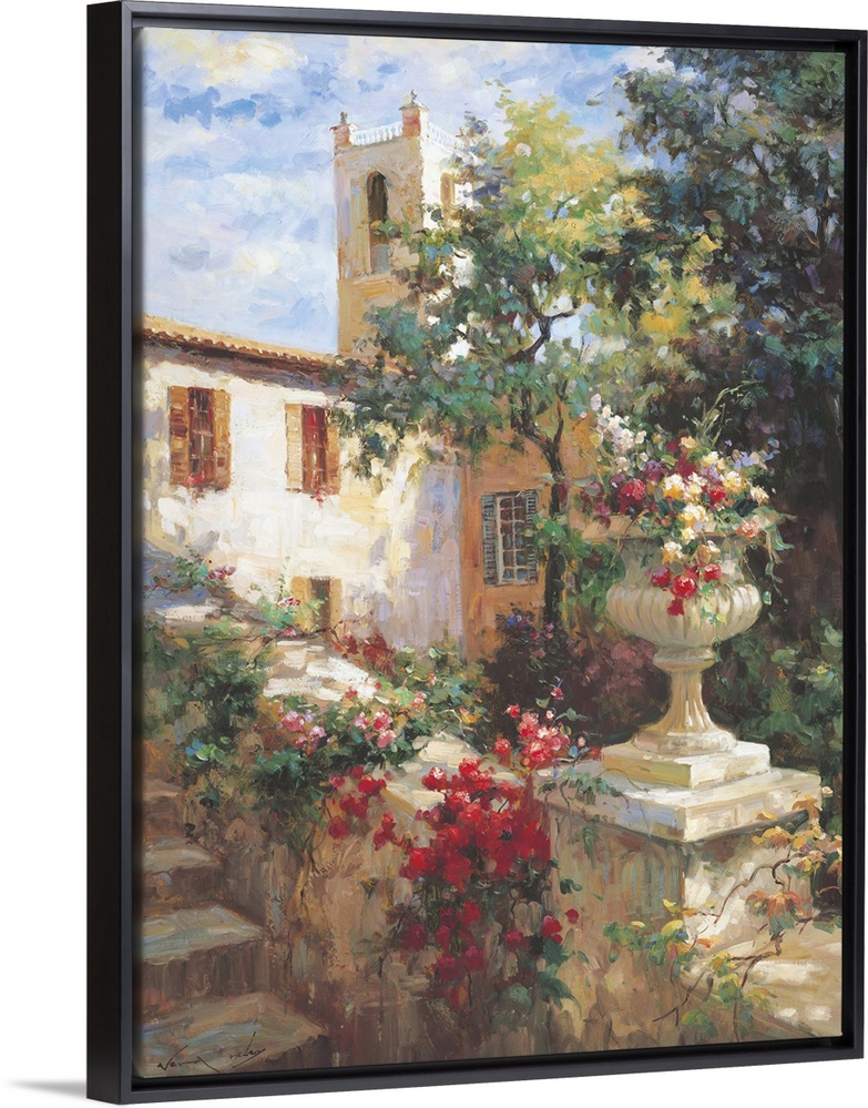 <p>Painting of an urn full of flowers in a garden.</p>
