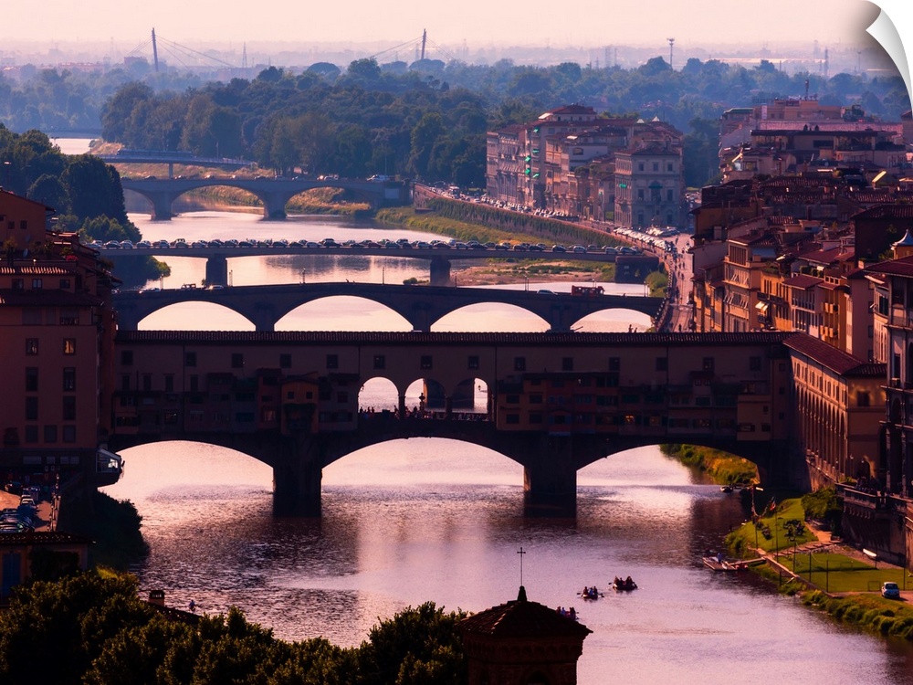 <p>Florence, Florence Province, Tuscany, Italy. View to bridges across arno river. Ponte Vecchio in foreground. The historic centre of Florence is a UNESCO world heritage site.</p>