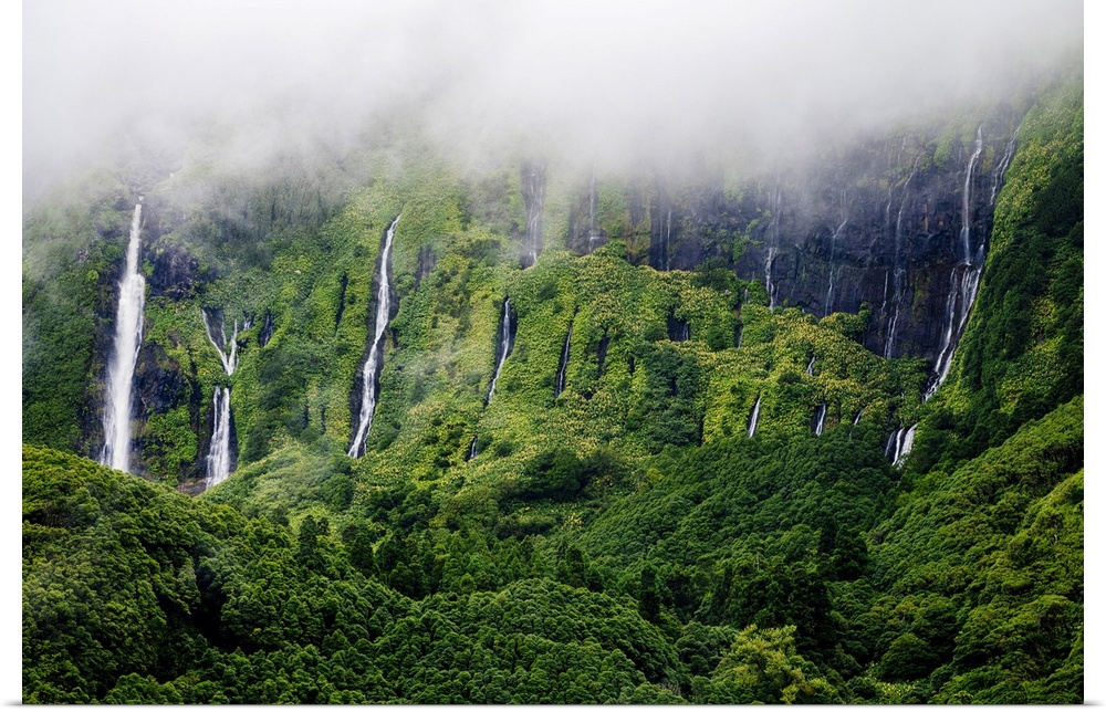 <p>Flores, Azores Islands, Portugal. Poco Ribeira do Ferreiro waterfalls, aerial view.</p>