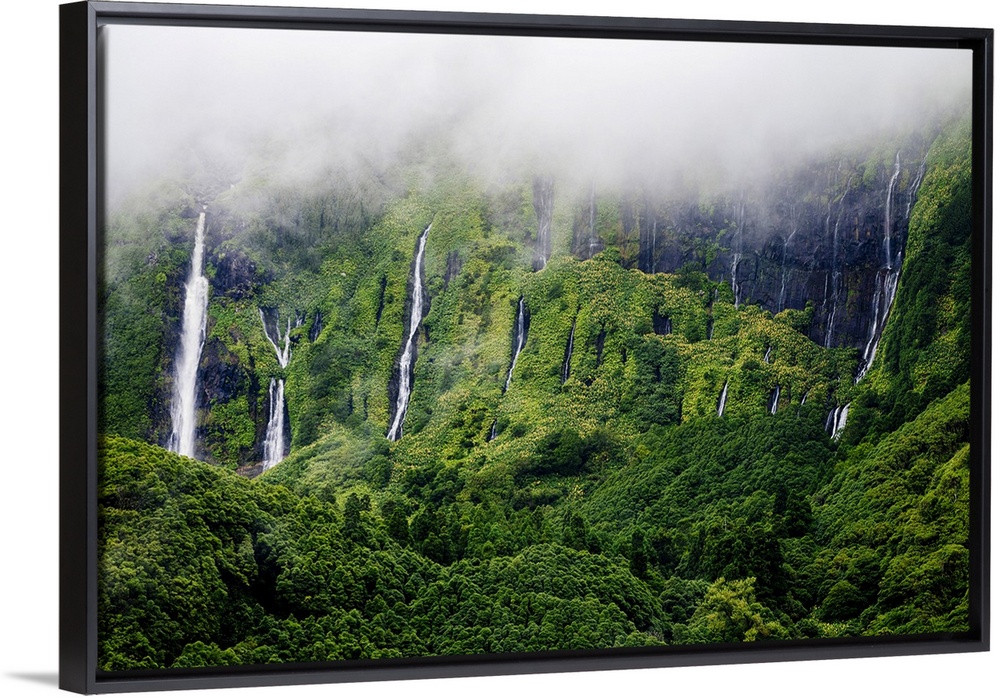 <p>Flores, Azores Islands, Portugal. Poco Ribeira do Ferreiro waterfalls, aerial view.</p>