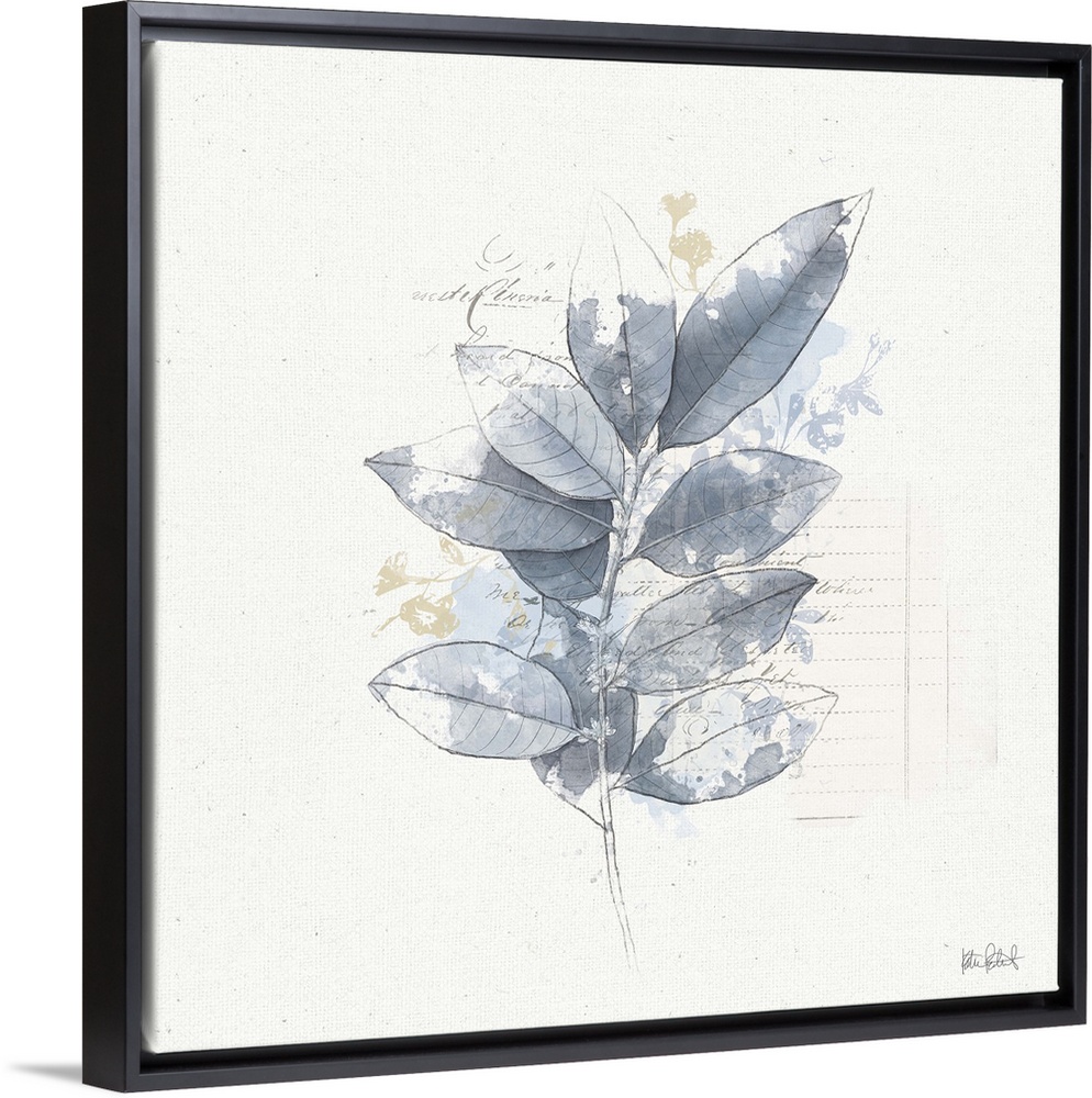 <p>Square collage art that has a blue watercolor branch with leaves and faint script on the background with a few small beige flowers.</p>