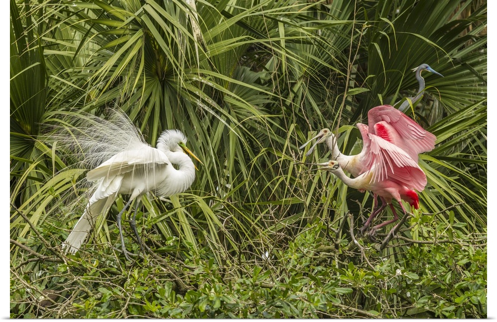 <p>Florida, Anastasia Island, Alligator Farm, Great Egret And Roseate Spoonbills Fighting</p>