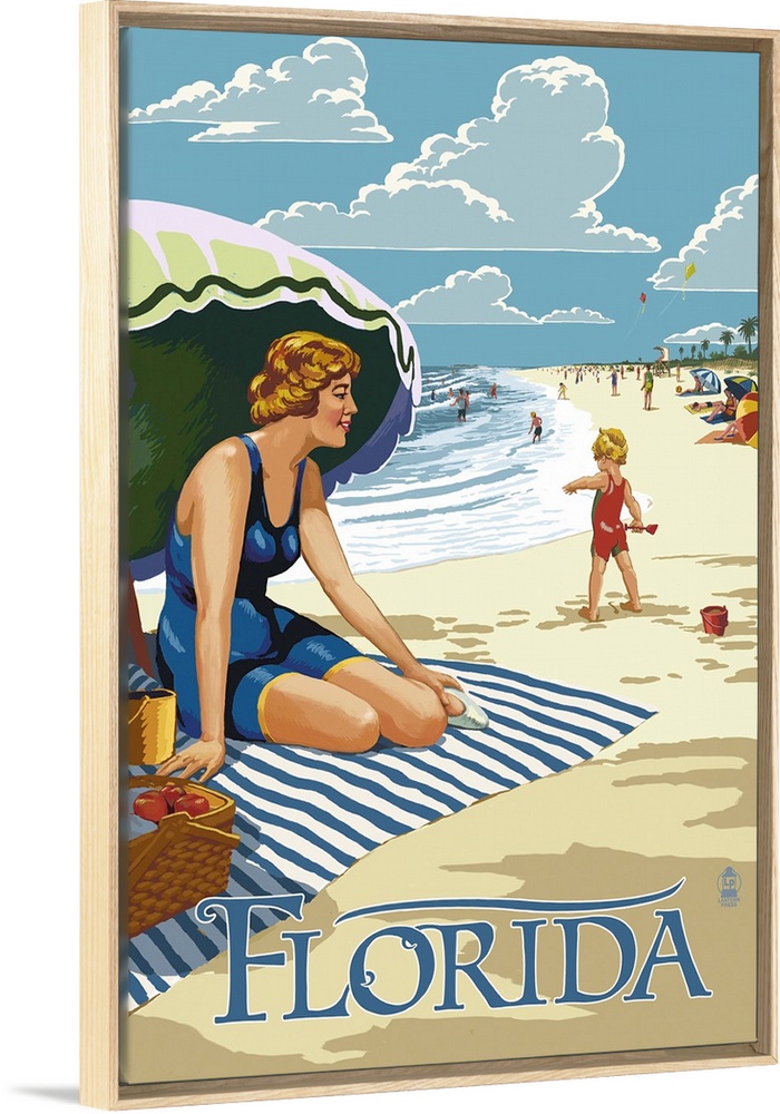 <p>Retro stylized art poster of a beach scene, with a woman sitting on a blanket under a an umbrella.</p>