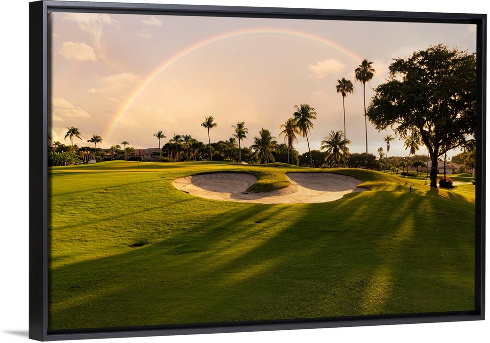 <p>Florida, Boca Raton, golf course with palm trees & rainbow.</p>