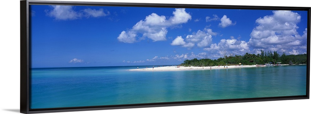 <p>Large panoramic photograph of a small beach off the coast in Florida with teal colored water surrounding it and clouds gliding above it.</p>