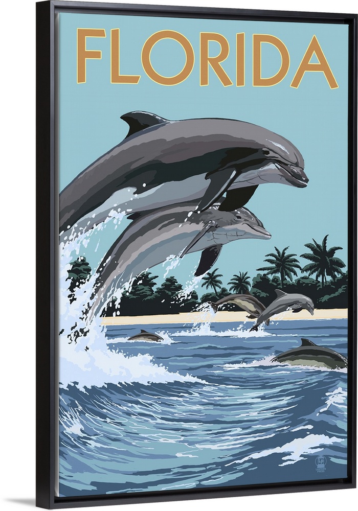 <p>A stylized art poster of a bottle nose dolphins jumping in and out of the surf off the coast of a sandy beach.</p>