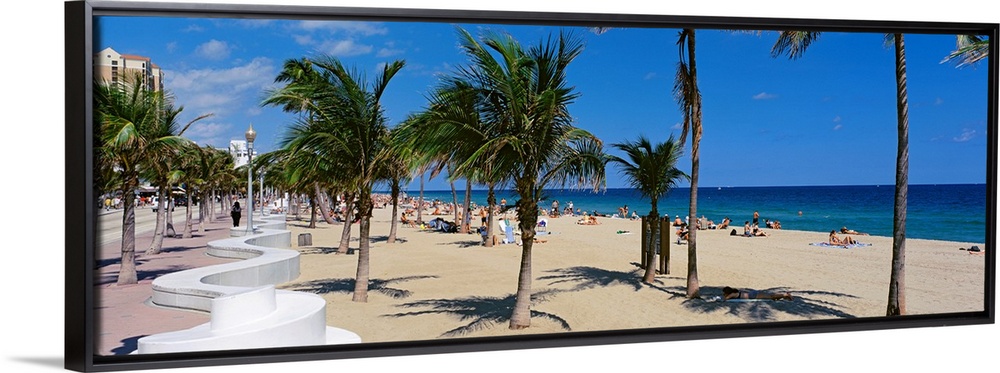 <p>Panoramic photograph showcases a lively beach scene scattered with people within Florida that has palm trees dusted throughout and a wavy shaped bench running into the distance. On the left hand side of the picture there are tall buildings overlooking the Atlantic Ocean.</p>