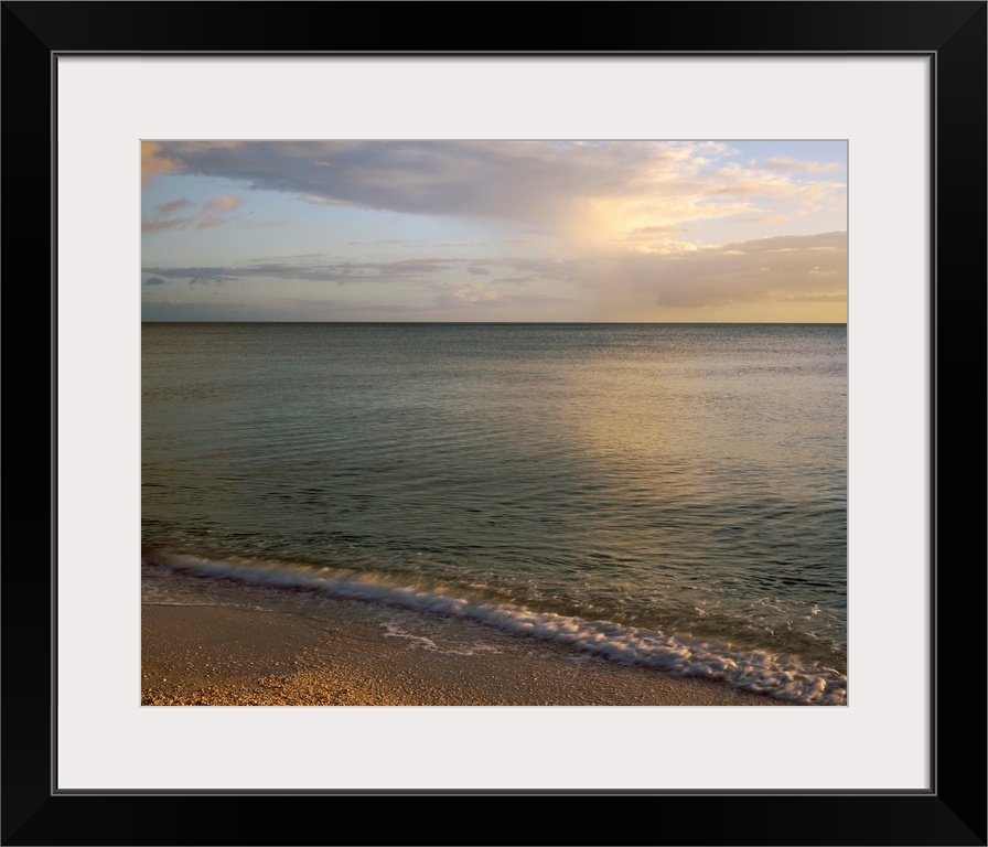 <p>Giant photograph shows the calm waters of a coastline as they gently crash against the sandy shores within the Southeastern United States.</p>