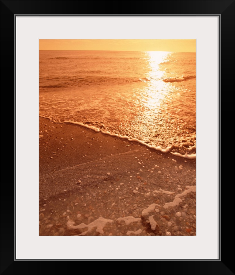 <p>Vertical photograph on a big canvas water rushing onto the shore of Sanibel Beach, Florida in the Gulf of Mexico. The sunset reflecting brightly over the water.</p>