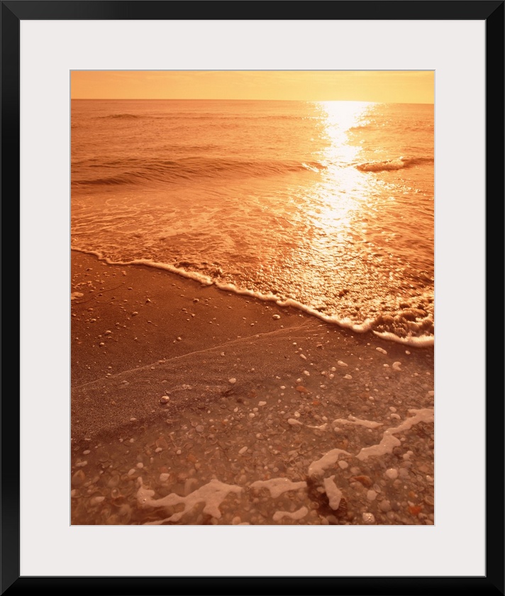 <p>Vertical photograph on a big canvas water rushing onto the shore of Sanibel Beach, Florida in the Gulf of Mexico. The sunset reflecting brightly over the water.</p>