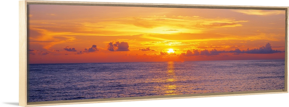 <p>This panoramic seascape shows the sun setting behind clouds on the horizon in this photographic art for the home or office.</p>