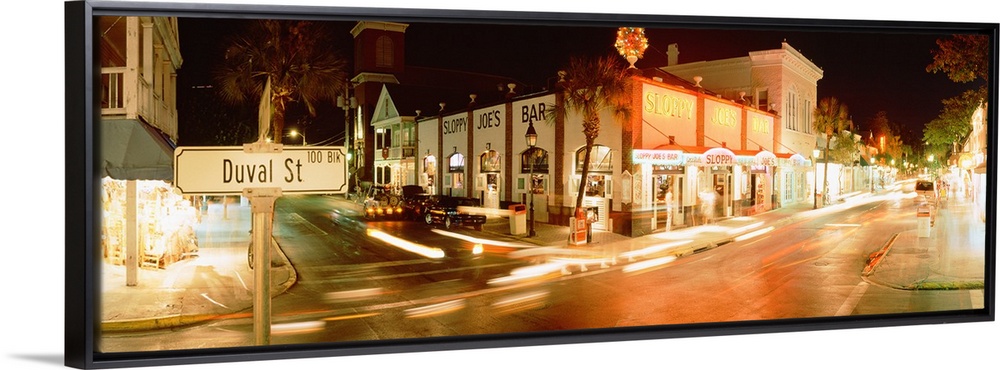 <p>Panoramic photograph of street level view of busy intersection. The buildings are lit up and the streets are filled with light trails.</p>