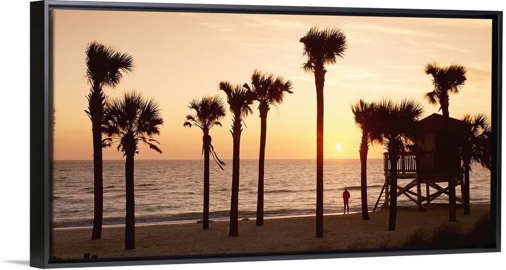 <p>Panoramic photo of palm trees lining a beach with a man standing on the shore looking out into the sea at sunset.</p>