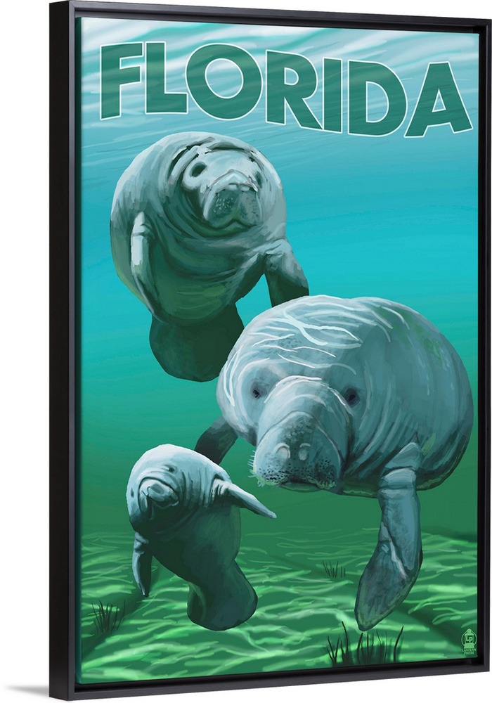 <p>Retro stylized art poster of manatees floating in a gentle green sea.</p>
