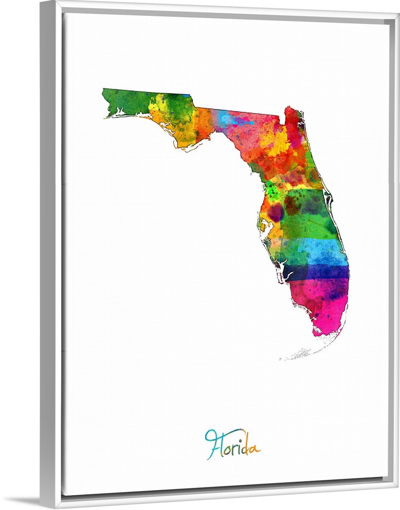 <p>Contemporary artwork of a map of Florida made of colorful paint splashes.</p>