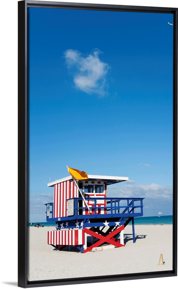 <p>United States, USA, Florida, Miami Beach, A plane and a cloud over an American beach hut</p>