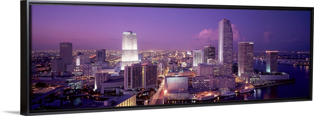 <p>Aerial photograph taken of an illuminated Miami skyline underneath a dusk sky.</p>