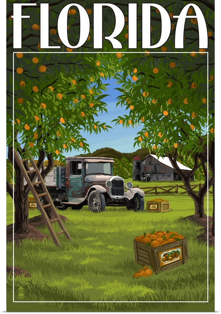 <p>Retro stylized art poster of a vintage truck sitting in an orange orchard.</p>