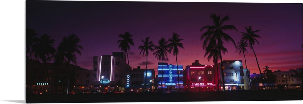 <p>A panoramic canvas of neon lights on art deco buildings on the shore front lined with palm trees.</p>