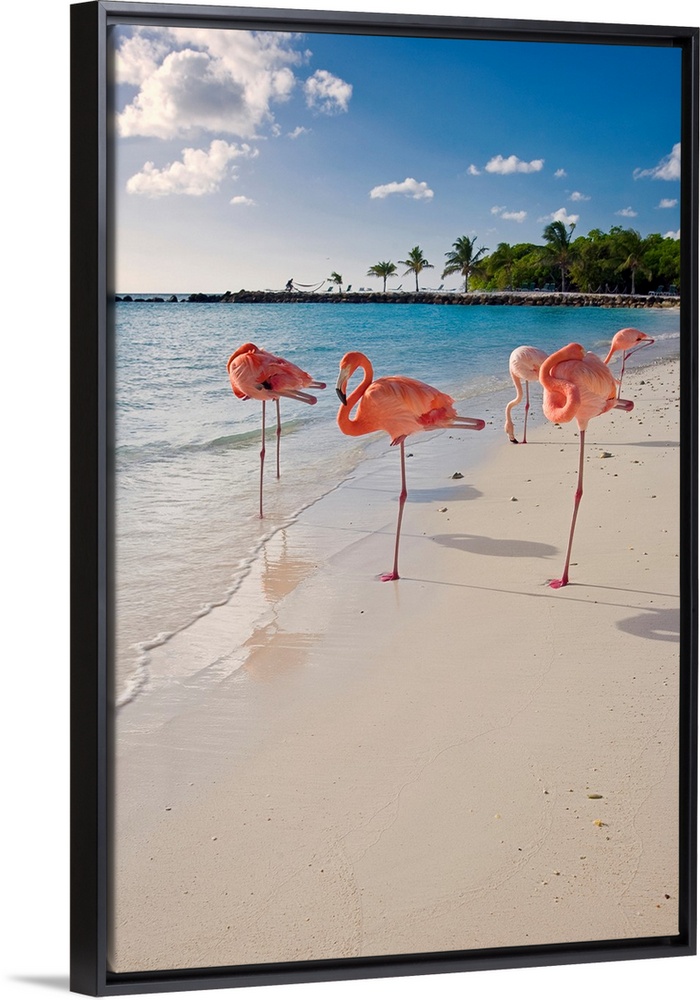 <p>This large wall art is a vertical photograph of five flamingos relaxing on a sandy, tropical beach.</p>