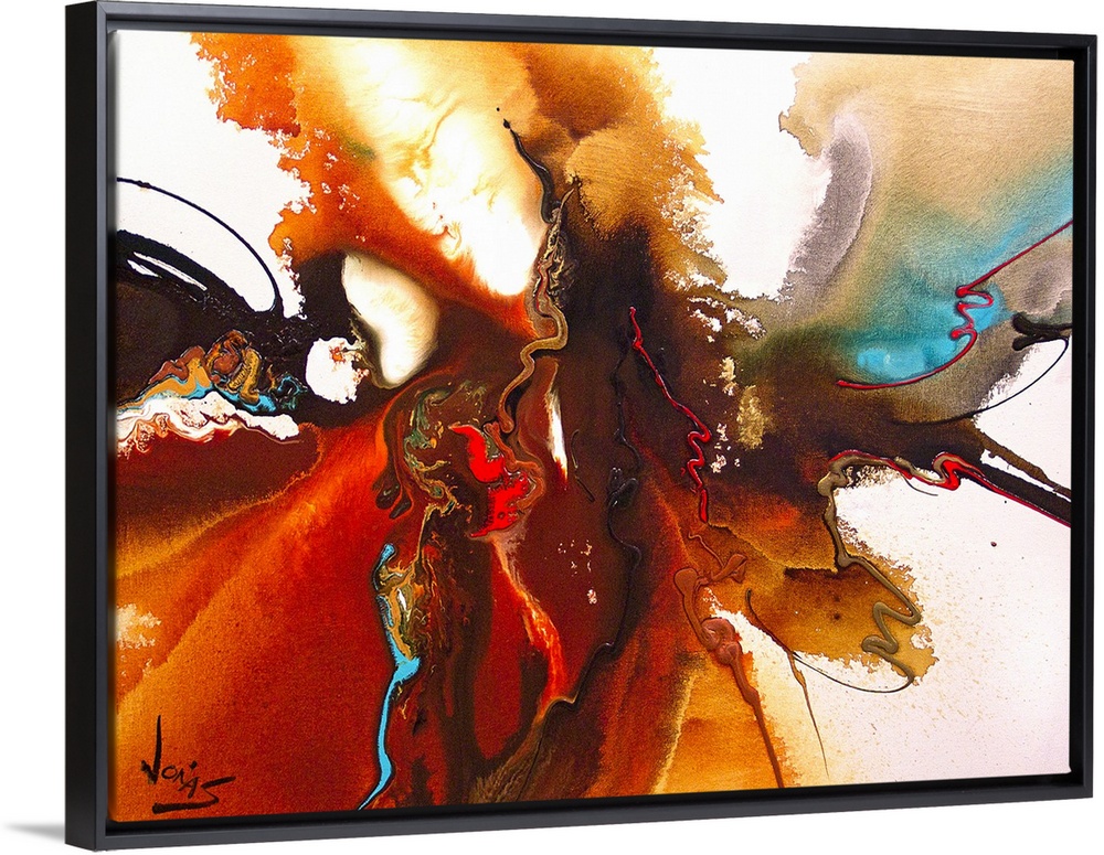 <p>Contemporary abstract painting using warm earthy tones with splashes of cool tones converging toward the center of the image in a fluid motion.</p>