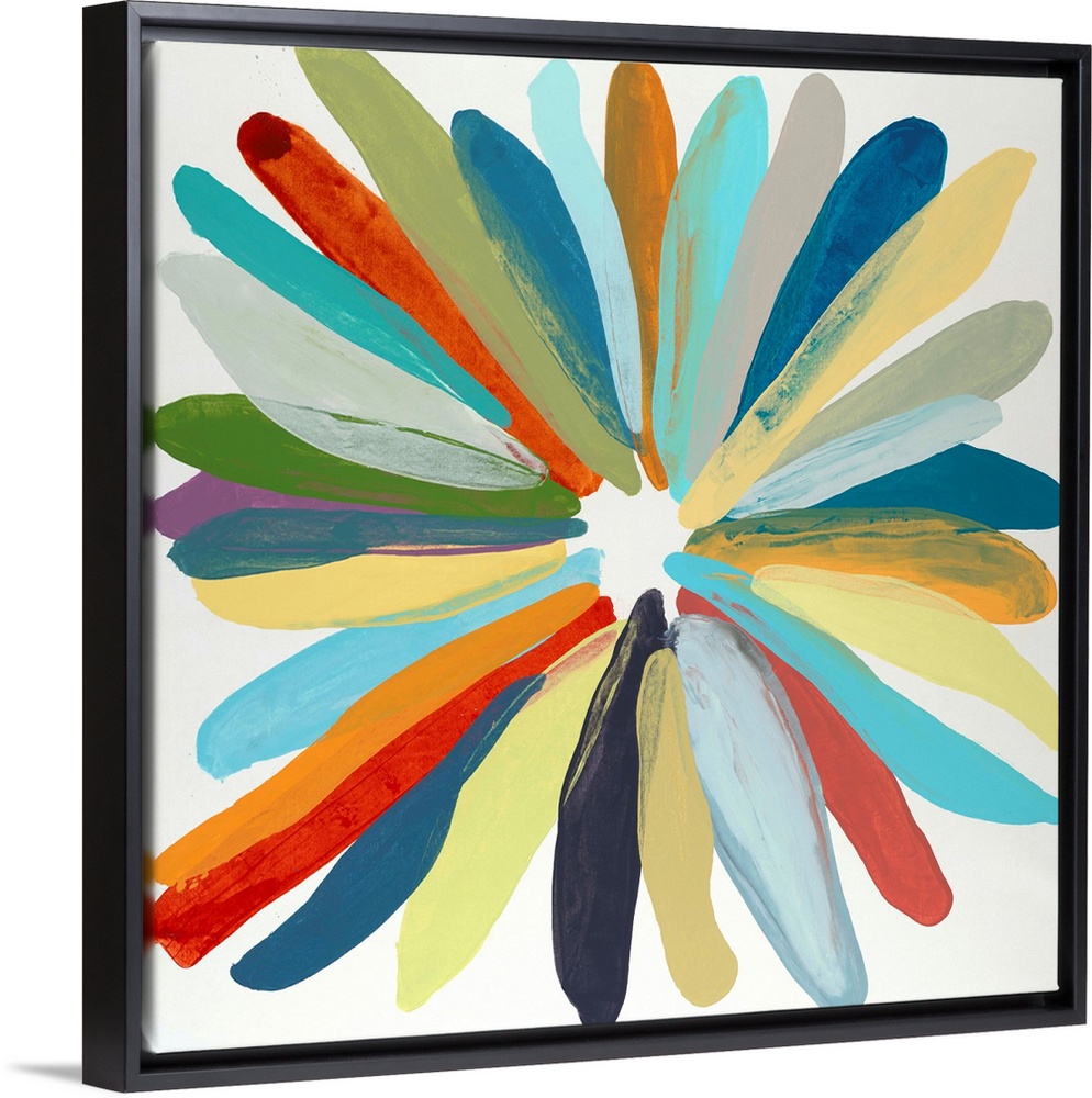 <p>Square painting with colorful brushstrokes layered together and placed in a circular formation resembling a flower.</p>