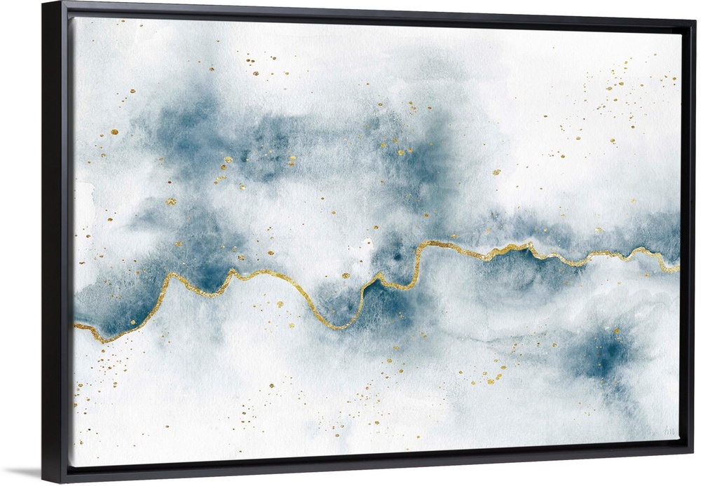 <p>Contemporary abstract painting with a shiny gold jagged line running horizontally across on a white and indigo background with gold paint splatter.</p>