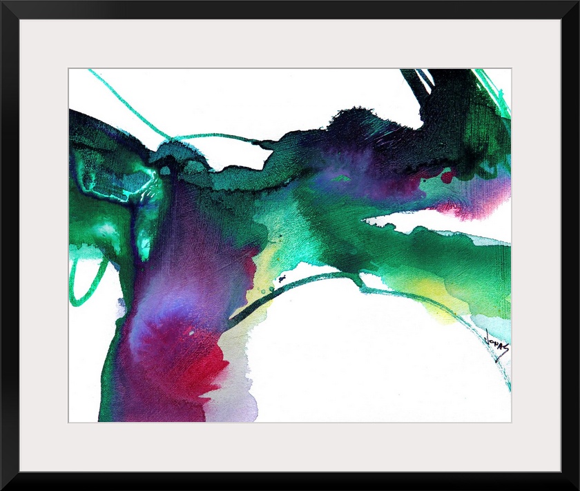 <p>Contemporary abstract painting with splashes of bold emerald color on a plain background, full of motion.</p>