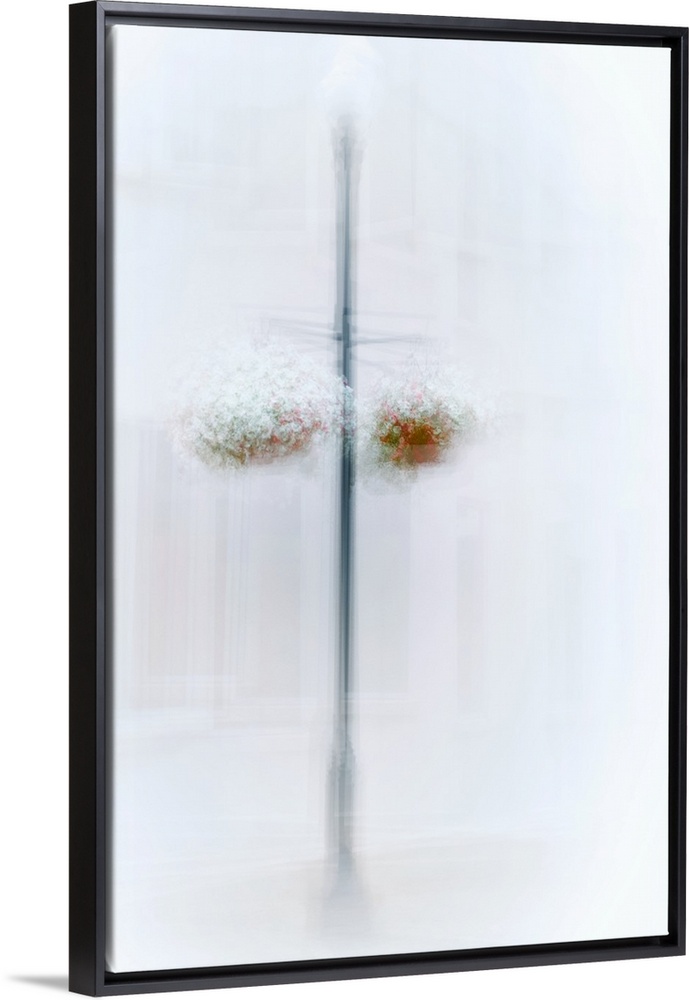 <p>Conceptual image of two hanging flower baskets on a post, obscured by hazy white light.</p>