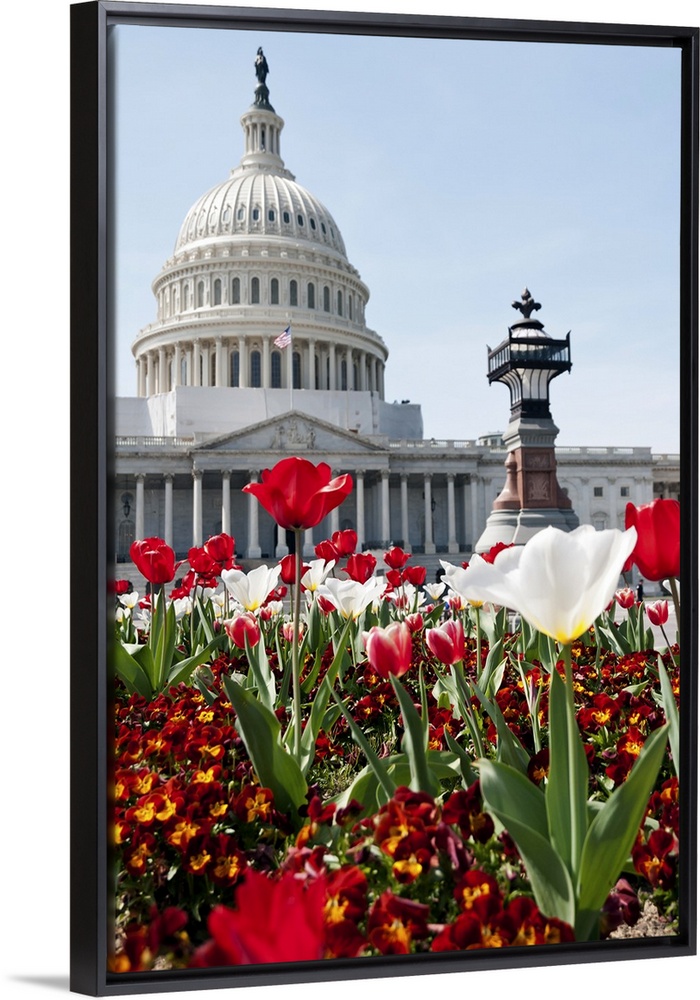 <p>Spring time in Washington, DC. Flower bed with tulips in front of the US Capitol Building. Selective focus on the foreground.</p>