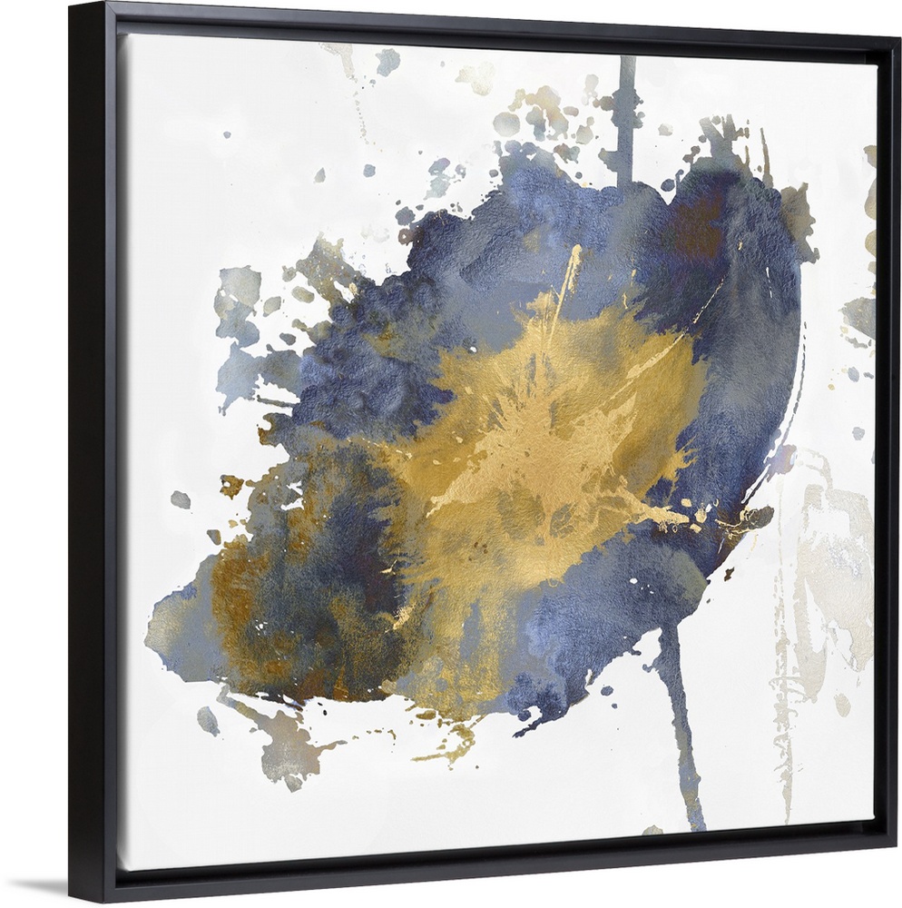 <p>Square decor with a single paint splattered flower in gold, silver, and blue hues.</p>