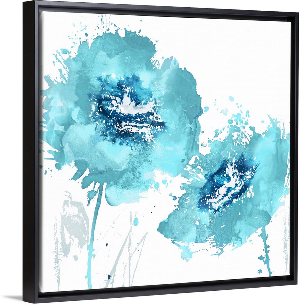<p>Square decor with two paint splattered flowers in shades of blue.</p>