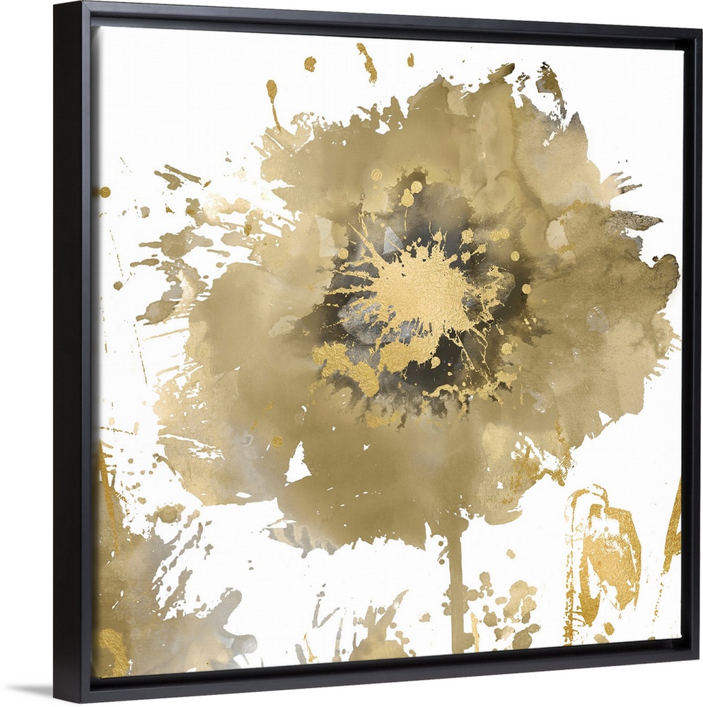 <p>Square decor with a single paint splattered flower in gold, silver, and black hues.</p>